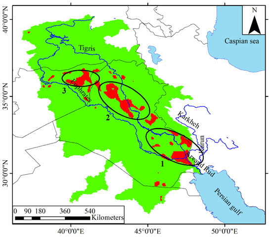Three main geographical zones of the TEB where LULC has changed significantly during 2000–2022. (1) East and south-east of Iraq, (2) north-west of Iraq, (3) east of Syria.