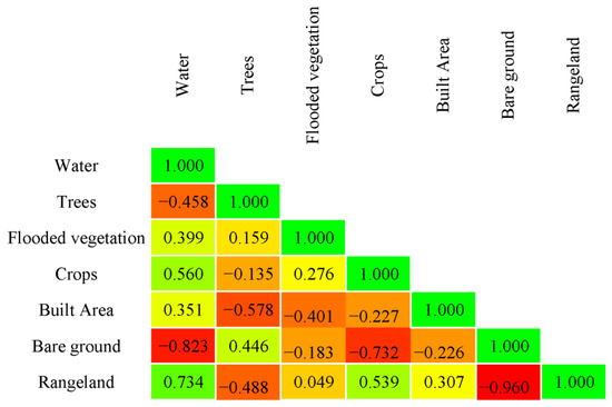 Pearson correlation coefficients were calculated to determine the linear relationship between LULC classes (Figure 7). It is a statistical criterion that has been widely applied as a measurement of relationships between two variables. It has a value between −1 and +1, where −1 indicates the negative relationship and the value of +1 means the positive relationship [33]. Investigating the relationship between LULC classes using Pearson correlation coefficients allows us to determine how the changes in an specific LULC class would impact the change in another LULC class. Our results revealed that water class had high anti-correlation with the bare ground (−0.823), moderate anti-correlation with trees (−0.458), high correlation with rangeland (0.734), and moderate correlation with crops (0.560). Trees class was associated with the bare ground (0.446) and dissociated with the built area (−0.578) and rangeland (−0.488). Flooded vegetation had moderate anti-correlation (−0.401) with the built area. Crop class had high anti-correlation with the bare ground (−0.732) and was associated with rangeland (0.539). Bare ground was highly anti-correlated with rangeland (−0.960). No more considerable correlation was observed.