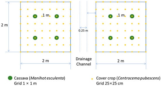 Schematic illustration of the planting pattern in each treatment. Cassava was planted as the main crop and centrosema as the cover crop in the intercropping system.