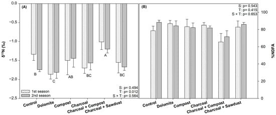 Nitrogen isotope discrimination (A) and percentage of nitrogen derived from N2–fixation (B) in centrosema under different soil amendments and growing season treatments. Treatments (soil amendments) are indicated on the x-axis, along with a “control” that did not receive any soil amendment. Values are means ± SE (n = 4). The effects of growing season (S), treatment (T), and the interaction of growing season and treatment (S × T) on nitrogen isotope discrimination and the percentage of nitrogen derived from N2–fixation were determined using robust two-way ANOVA. Uppercase letters below the bars in (A) indicate significant differences in the overall treatment effect using the post hoc linear contrast test on trimmed means at p < 0.05.