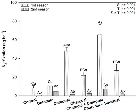 Amount of nitrogen fixation in centrosema under different soil amendments and growing season treatments. Treatments (soil amendments) are indicated on the x-axis, along with a “control” that did not receive any soil amendment. Values are means ± SE (n = 4). The effects of growing season (S), treatment (T), and the interaction of growing season and treatment (S × T) on nitrogen fixation were determined using robust two-way ANOVA. Uppercase letters above the bars indicate significant differences between treatments during the same growing season, and lowercase letters indicate significant differences between growing seasons under the same treatment using the post hoc linear contrast test on trimmed means at p < 0.05.