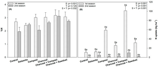 Nitrogen content (A) and nitrogen uptake (B) in centrosema under different soil amendments and growing season treatments. Treatments (soil amendments) are indicated on the x-axis, with a “control” that did not receive any soil amendment. Values are means ± SE (n = 4). The effects of growing season (S), treatment (T), and the interaction of growing season and treatment (S × T) on nitrogen content and nitrogen uptake were determined using robust two-way ANOVA. Uppercase letters above the bars in (B) indicate significant differences between treatments in the same growing season, and lowercase letters indicate significant differences between growing seasons with the same treatment using the post hoc linear contrast test on trimmed means at p < 0.05.