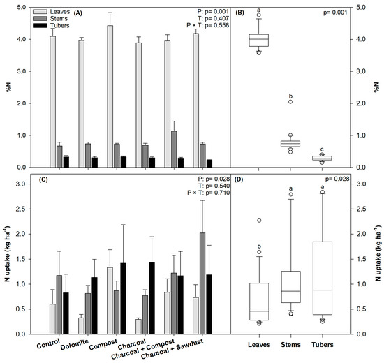 Nitrogen content (A,B) and nitrogen uptake (C,D) in cassava under different soil amendments and plant part treatments. Treatments (soil amendments) are indicated on the x-axis, with a “control” that did not receive any soil amendment. Values are means ± SE (n = 4). The effects of plant part (S), treatment (T), and the interaction of plant part and treatment (S × T) on nitrogen content and nitrogen uptake were determined using robust two-way ANOVA. Lowercase letters in (C,D) indicate significant differences between plant parts using the post hoc linear contrast test on trimmed means at p < 0.05. In (C,D), open circles indicate outliers.
