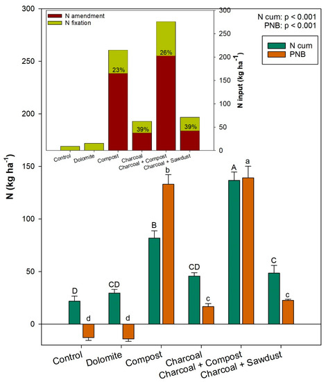 According to the estimation of partial soil N balance (PNB), the control and dolomite treatments had a negative N balance because no N was added via amendments. The high positive PNB in the combined treatment of charcoal and compost, on the other hand, suggests that significant amounts of N from the amendments remained in the soil. This condition would be beneficial for N2–fixation if maintained below the inhibitory threshold (approximately 30 kg inorganic N per ha−1), as was found in a previous study [60]. The nitrogen fixed by the legume plants can be used to fertilize the soil [61,62], thereby promoting crop growth in poor and low-input soils.