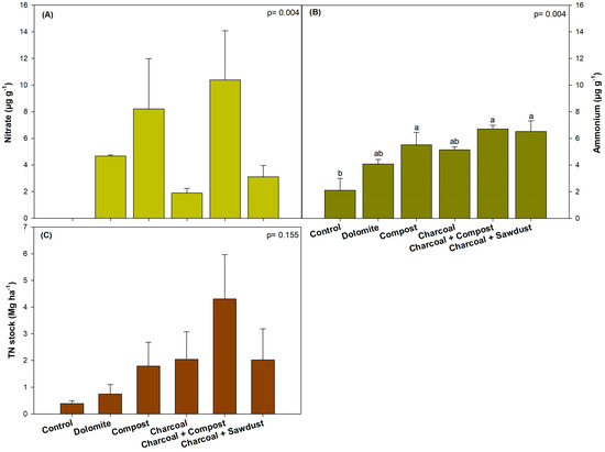 Soil nitrate (A), ammonium (B), and total nitrogen stock (C) under different soil amendment treatments. Treatments (soil amendments) are indicated on the x-axis, with a “control” that did not receive any soil amendment. Values are means ± SE (n = 4). The effects of treatment on nitrate, ammonium, and total nitrogen stock were determined using parametric one-way ANOVA. Lowercase letters in (B) indicate significant differences between treatments using the post hoc linear contrast test at p < 0.05.