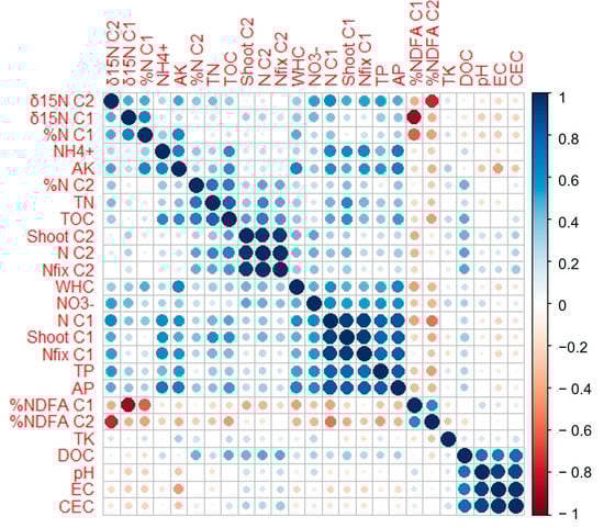 Heat map showing the relationships among shoot dry matter (shoot), nitrogen isotope discrimination (δ15N), nitrogen content (%N), percentage of nitrogen derived from the atmosphere (%NDFA), nitrogen uptake (N), and nitrogen fixation (Nfix) in the first and second seasons of centrosema (C1 and C2), with some soil physicochemical properties (total nitrogen (TN); nitrate (NO3−); ammonium (NH4−); total phosphate (TP); available phosphate (AP); total potassium (TP); available potassium (AP); total organic carbon (TOC); dissolved organic carbon (DOC); water-holding capacity (WHC); pH; electrical conductivity (EC); and cation exchange capacity (CEC)). The color gradient represents Pearson correlation coefficients when significant (n = 24, p < 0.05).