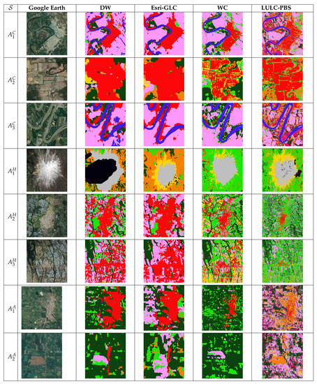 - Dominant Classes: This occurs when pixels of a given class appear more often than the rest in a map. For instance, urban coverage is observed in most pixels of the reference images of sub-areas and with some pixels corresponding to bare ground and vegetation. In WC and LULC-PBS maps, most pixels are classified as urban areas while keeping a proportional relationship to the features seen in the corresponding reference image, whereas Esri-GLC and DW maps show a single large urban patch. Similarly, in sub-area where an urban area is surrounded by vegetation. Here, vegetation could be interpreted as agricultural mosaics, therefore overestimating the predominant land use class. In sub-area , most rivers’ pixels in the reference image were labelled as urban areas in Esri-GLC and DW maps, whereas in the WC map, some of them are detected as bare ground. In the LULC-PBS river, pixels were correctly classified as water.