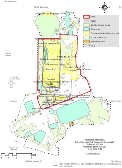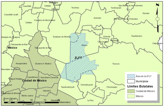The FZLT has an approximate area of 12,200 ha and is located in the east of the metropolitan area, in the municipalities of Atenco, Texcoco, Ecatepec de Morelos, Nezahualcóyotl, and Chimalhuacán in the State of Mexico [6,7].