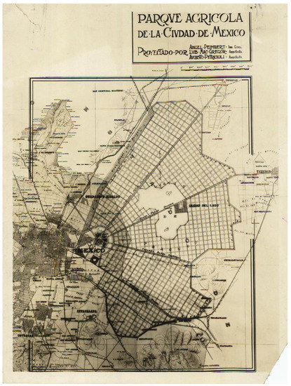 - Peimbert, A.; mac Gregor, L.; Petricioli, A. Plano Del Parque Agrícola de La Ciudad de México [Plano] 1:8000. Available online: https://mapoteca.siap.gob.mx/index.php/cgf-df-m6-v12-0664-1-27/ (accessed on 15 May 2022).
