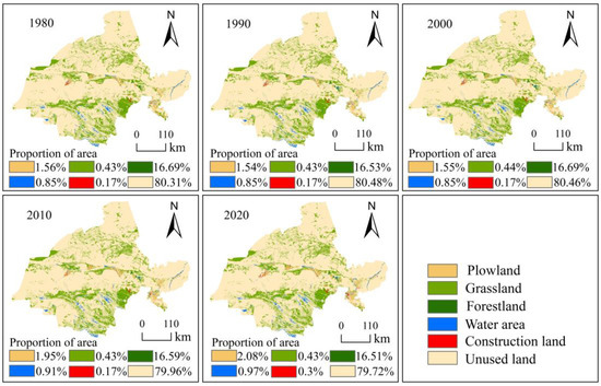 In the study area, unused land and grassland cover 95% of Jiuquan, with unused land accounting for 79% of the area (Table 2). There were no significant changes in the spatial distribution characteristics of land use types in Jiuquan between 1980 and 2020 (Figure 2). Grasslands and forestlands are more concentrated in the north in the Horsehair Mountains and in the south in the Alpen gold, DangHenan Mountain, Mustang South Mountain and Daxue Mountain regions, with a horizontal band in the center. Plowland and construction land are distributed along the Shule River and Black River; the rest is unused land. During 1980–2020, the area of plowland, water area and construction land showed a significant increasing trend; especially after 2000, the increase of plowland and construction land was significantly accelerated, with an increase of 864.76 km2 and 229.22 km2 respectively. The total area of grassland and unused land decreased, while the area of forest-land remained basically unchanged. The reason for this is that the expansion of plowland and construction land is mainly due to the increase in population in Jiuquan. Since 1983, Jiuquan has successively implemented a number of migration programs, including the Two West program migration, the Shule River construction project migration and the Jiudian Gorge migration, accumulating about 150,000 migrants by 2008 and developing a plowland area of over 7500 km2. It is mainly concentrated in the oasis areas of Guazhou, Yumen and Jiuquan. In addition, with the rapid increase in population, the area of construction land is expanding rapidly. Although the expansion of construction land is dominated by unused land, it still has a significant effect on the encroachment of grassland and plowland in the central oasis area of Jiuquan. The main reason for the increase in water area may be related to the implementation of water conservation policies and the construction of water conservancy projects in Jiuquan in recent years. In recent decades, Jiuquan has achieved remarkable results in agricultural water conservation, groundwater extraction and comprehensive management of corporate wastewater and has built a number of water conservation projects, such as the Danghe Reservoir and the Changma Reservoir, which have led to a rise in the water level of rivers and an expansion of the water surface area of rivers and lakes. The reduction in grassland and forestland areas may be related to human activities and vegetation degradation in the oasis area. The implementation of ecological protection projects and policies has led to the conversion of large areas of wasteland into forestland and grassland, but the ecological background of Jiuquan is fragile, and there is still significant vegetation degradation in local areas. Therefore, land use type changes in the oasis area of Jiuquan are closely related to human activities, and excessive development and construction can lead to ecological degradation in the oasis area. Land use changes in other areas are mainly due to natural causes.