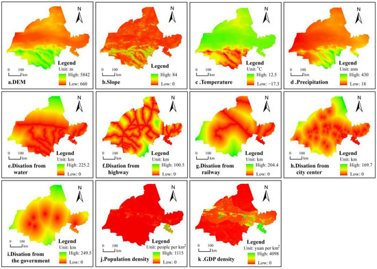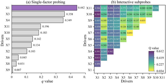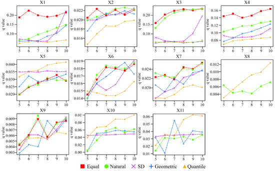 In this paper, 11 continuous factors of elevation (X1), slope (X2), air temperature (X3), precipitation (X4), distance from water (X5), distance from roads (X6), distance from railways (X7), distance from the city center (X8), distance from the government (X9), population density (X10), and GDP density (X11) were optimally discretized (Figure 8). Taking precipitation as an example, the q value is the largest when the number of intervals in the equal interval classification method is 10, so the precipitation should be divided into 10 categories by equal interval classification in the geographic detector as the optimal parameter selection, and the other driving factors are the same.
