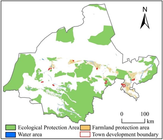 (4) Ecological protection scenario (SE): Comprehensively considering the food security and resource and environmental carrying capacity of Jiuquan City, in order to improve the intensity of ecological protection, it is necessary to add the concepts of cultivated land protection and ecological environmental protection, and set the permanent basic farmland protection area, ecological reserve and water area required by the Gansu Provincial Land and Spatial Plan (2019–2035) as prohibited conversion areas (Figure 6).