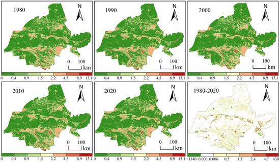 As shown in Figure 7, forestland and grassland are widely distributed in the south, middle and north of Jiuquan City, with high ESV. Other areas are mostly unused land with low ESV. From 1980 to 2020, due to urbanization, the land use types in the central and eastern oases changed frequently, resulting in significant spatial changes in ESV. The ESV in the south and north increased slightly and remained unchanged in other areas.
