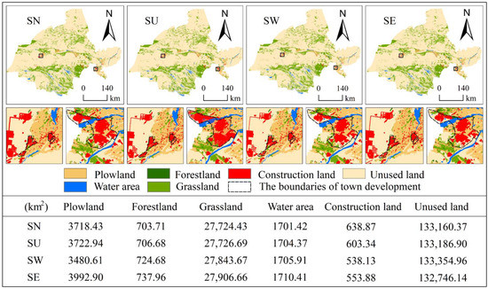 The simulation results show that the spatial distribution pattern of land use in Jiuquan City is basically the same under the four scenarios (Figure 10), but there are differences in the changes of each land use type in the different scenarios. The SN scenario is a continuation of the historical development pattern, with a large amount of construction and development leading to a significant increase in the area of built-up land and mainly outward expansion, with a strong encroachment on ecological land such as plowland, forestland and grassland. The SU scenario, with its restrictions on urban development boundaries, has led to a more concentrated and predominantly infill expansion of construction land in the oasis area, with less encroachment on ecological land outside the urban development boundaries. The restriction on total water use in the SW scenario results in the smallest increase in the area of plowland and construction land in the study area. The grasslands in the oasis areas of Dunhuang, Guazhou and Yumen have not been significantly developed or destroyed, and there has been a large increase in the area of forestland and grassland. In the SE scenario, the largest increase in the area of plowland, forestland, grassland and water was due to the increased protection of the ecological environment, and it was mainly converted from unused land. In general, the SE scenario is more suitable for the future development of Jiuquan City from the perspective of improving the quality of the regional ecological environment.