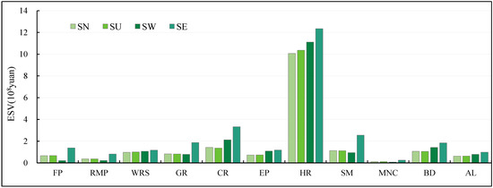 In 2035, the ESV of SN, SU, SW and SE will increase (Figure 11), which are CNY 144.408 billion, CNY 144.424 billion, CNY 144.617 billion, and CNY 145.401 billion, respectively. SN’s ESV increase was the smallest, indicating that the traditional development model is no longer suitable for the future development trend of Jiuquan City, and the development strategy needs to be adjusted in time. From each individual point of view, ESV showed an increasing trend, with the largest increase in hydrological regulation ESV and the smallest increase in maintaining nutrient cycle. The individual ESVs in SN and SU were small, mainly because the area of forestland and grassland was significantly smaller than that of SW and SE. The gas regulation and climate regulation of SN is slightly higher than that of SU, because the area of construction land in SN is large, and the ESV of construction land is higher than that of unused land. The ESV of food production, feedstock production, soil conservation and maintenance nutrient cycling in SW was lower than in other scenarios, mainly because the cultivated land area in this scenario was the smallest. In SE, because the protection of cultivated land, grassland, forest land and water area is the largest, the ESV of each individual is significantly higher than that of other scenarios.