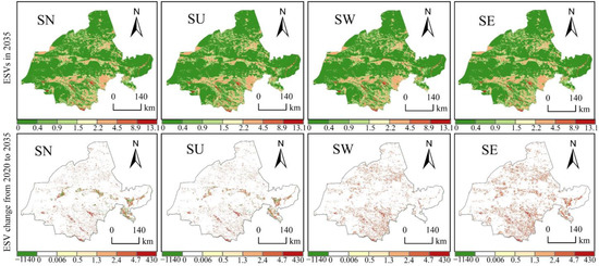 (4) Compared with 2020, ESV will increase in all four scenarios in 2035. The ESV increase in the SE scenario was the largest, and the ESV of each individual was significantly higher than that of other scenarios.