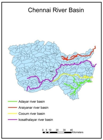 Chennai City is a hydrologically significant coastal zone of the Tamil Nadu state in southern India. The Chennai River catchment, a significant tributary of the state, covers an area of about 6118 km2. The length of the river catchment is 200 km, and its width varies from 120 km to 180 km. The maximum elevation and minimum elevation from the mean sea level are 1219 m and 5 m, respectively. The natural ecosystem of Chennai comprises four rivers, five wetlands, and six forest areas. It has several stream networks and reaches out to four districts of Tamil Nadu, namely Thiruvallur, Kancheepuram, Chennai, and Vellore. Adayar, Arainayar, Coovum, and Kosathalayar are the four essential rivers draining the catchment covering areas of 826.517 km2, 1426.234 km2, 463.976 km2, and 3684.274 km2, respectively, as shown in Figure 2 [30].
