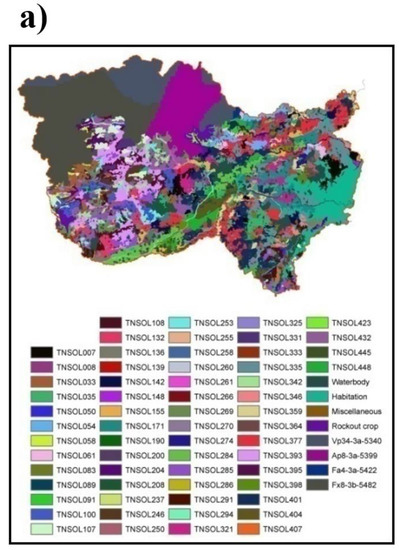 For the region of Tamil Nadu, the maps were obtained from the Tamil Nadu Agricultural University (TNAU), Coimbatore, which has a resolution of 1:50,000. The other source is the Food and Agriculture Organization of the United Nations, FAO, with a resolution of 1:10,000,000. FAO maps were used for the northern part of the catchment situated in Andhra Pradesh, where TNAU maps were not available [32,33]. The two maps obtained for the year 2007 were combined to obtain continuous soil information for the entire study area (Figure 3a).
