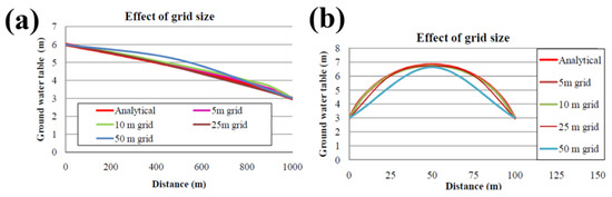 Variation of groundwater levels with different grid sizes for aquifer (a) without recharge and (b) with a recharge in the catchment.
