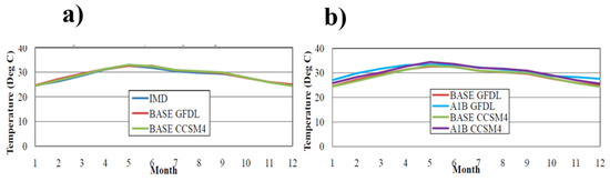 Long-term mean monthly temperatures over a 20-year period in the study area for (a) IMD and Baseline scenarios and (b) Baseline and A1B scenarios.