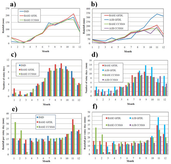 Figure 6 depicts the long-term average monthly rainfall, rainy days, and rainfall intensity of the IMD gridded data, as well as the bias-adjusted present and future climate scenarios of GFDL and CCSM4. The maximum deviations in rainfall in Baseline scenarios of GFDL and CCSM4 from IMD were observed in January (30 mm) followed by November. November is the wettest month in the Chennai River catchment with heavy rainfall occurrence from the Northeast (NE) monsoon. Decreasing trends were observed for CCSM4 (15 mm) for November while GFDL (26 mm) showed increasing trends. The trend significance patterns while using two different present climate scenarios show the uncertainty in the climate models to predict the NE monsoon [19]. According to the IMD gridded data, October has the maximum number of rainy days, whereas the present climate of GFDL and CCSM4 predicts September to have a greater number of rainy days. As stated before, they throw light on the further improvements that are needed in the climate models to understand the dynamics of the Indian retreating monsoons [52,53]. The analysis showed an insignificant trend of rainfall intensities in the present and future climate. The rainfall intensity tends to increase in the A1B GFDL scenario, and maximum rainfall intensity is expected in November. However, A1B CCSM4 predictions show a reduction in the intensity of rainfall in future climatic conditions. Therefore, improved precipitation data within climate change scenarios with excellent and consistent prediction capacity on micro scales is a requisite to understanding the impacts of climate variability on social, economic, and environmental vulnerability [54].