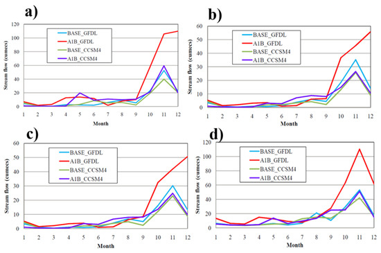 Figure 7 outlines the projected changes in monthly stream flows concerning the baseline climate under A1B scenarios. In both A1B scenarios, the average monthly stream flows were projected to increase at the four sub-catchments of the study area [55]. However, the A1B simulations with GFDL climate data predicted much higher flow volumes compared to A1B CCSM4. This is an indication of the uncertainty of GFDL and CCSM4 climate change models in simulating the future climate for the same emission scenario of A1B [21,52]. The stream flow increases in the A1B GFDL scenario (ranging from 25 cumecs to 50 cumecs) were noticeably higher than that of A1B CCSM4 (ranging from 2 cumecs to 20 cumecs), especially for NE monsoon. The increased future stream flows in NE monsoon could be due to less accumulation of snowfall that would result from the decreased intensity of rainy days in NE monsoon. This is based on the assessments in Figure 6 that indicate that precipitation will decrease in NE monsoon compared to Southwest (SW) monsoon while they increase in spring. Conversely, decreased stream flows were predicted for July and August in A1B GFDL and for January and February in A1B CCSM4, respectively. It was interesting to note that no projected variations were observed for the summer months of March and April at all sub-catchments and under both scenarios. This contrasts with the research showcasing the weakening of precipitation events and stream flow in the Indian summers [56,57]. Overall, the projected stream flow changes in this study appear more important than the projected changes in precipitation. This could be because of the non-inclusion of the factors of atmospheric deposition, snow cover, and annual land use land cover variations, as well as the theoretical approach in rainfall estimation, which inbuilt into the SWAT-FEM model [14]. To add on, the increase in mean stream flow under both future scenarios ratifies the increasing temperature patterns in the catchment [58]. Overall, the mean monthly stream flows were projected to increase by 21–25% by the end of the century in the Chennai River under A1B scenarios from GFDL and CCSM4.
