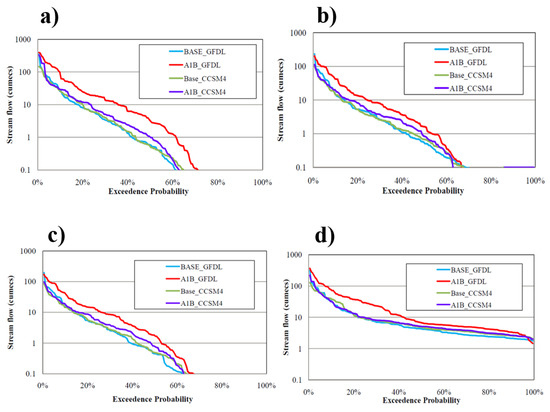 Figure 8 displays the analogy of flow duration curves during the baseline periods and the future periods under A1B scenarios at the four sub-catchments of the Chennai River catchment. The results show that the probability of occurrence of flow and magnitudes of flow could be higher in the future in the study area under both scenarios. In this analysis, high flows are depicted by 10% exceedance (S10), medium flows by 60% exceedance (S60), and low flows by 95% exceedance (S95) under all scenarios. Under the A1B GFDL scenario, high flows and medium flows were projected to increase spatially for the catchment, with the ranges 12–32% (S10) and 8–54% (S60), respectively. This is in conformance with the increases in average monthly estimates of rainfall and temperature in the basin, as illustrated in Figure 5 and Figure 6. However, notable estimates of S95 were only predicted in the sub-catchment of Arainayar by A1B GFDL and were found to decrease by 21% in the future. This signifies the importance of spatial heterogeneity of water flows and their temporal dynamics in addressing the uncertainty in the sub-basin scale stream flow predictions within the Chennai River catchment for climate change impact assessments [19]. On the other hand, flow duration curves for the A1B CCSM4 scenario projected fewer positive deviations from Baseline CCSM4 (0–8% for S10 and 2–20% for S60) compared to the GFDL scenarios in present and future averaged for the catchment. Despite the closeness between the two present climate scenarios, two future climate scenarios that were developed using the same emission approach predicted differing flow magnitudes, all of which can affect the quantification of stream flow responses using future climate change models [59].
