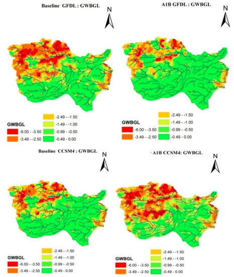As land-climate change is a complex phenomenon, it is tough to comprehensively assess climate change impacts on surface water and groundwater spatially and temporally. Various shreds of the literature indicated that GFDL scenarios are a good predictor of temperature for the Asian continent, where climate change had profound effects over the last two decades. However, the GFDL scenario is found to be a less likely predictor of precipitation effects and their geostatistical trends for future climate conditions [65,66]. Some of the past research compared different global climate models using their representative concentration pathways. They highlighted that GFDL and CCSM4 models provide optimal performance for temperature and precipitation changes in annual and inter-annual time frames for African watersheds. These studies emphasized that urban environments should be the focus of climate change projection for effective water resources management. Recent studies remarked that CCSM4 simulations provide reasonable predictions in the secular Arctic climate domains where greenhouse forcing and significant land and climate sensitivity prevail [67].