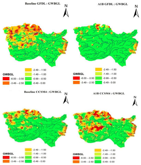 The spatial groundwater storage estimates of the catchment were developed using the monthly average groundwater below ground levels (GWBGL), obtained from the SWAT-FEM model. They were compared for the Baseline scenarios and A1B scenarios from both models for the managed conditions of the watershed. The spatial distribution of the GWBGL in the four sub-catchments of the Chennai River catchment was reported for the driest month of February (Figure 9) and the wettest month of November (Figure 10) to scrutinize the seasonal variability of climate change impacts on groundwater hydrology [60]. The groundwater storage is expected to increase in A1B GFDL concerning Baseline GFDL, whereas it is predicted to decrease in A1B CCSM4 concerning Baseline CCSM4. These conflicting results indicate the importance of more accurate predictions in the distribution of rainfall. This is because the number of rainy days and hence rainfall intensities during the rainy days are estimated to be quite different, although both models show similar rainfall predictions (Figure 6). Spatially, the variability in groundwater storages was majorly observed in the northwestern portion of Chennai River comprising Kosthalayar and Arainayar sub-catchments by the end of the century in both scenarios. The results show that the spatial distribution of the groundwater storage is not affected much by climate change according to the model predictions (0–0.89 m), except for the northwest of the Chennai River catchment (0.50–2.49 m). However, the most distinctive is a conflicting trend of the future groundwater storage predictions from two climate change models of GFDL and CCSM4 [61]. We recommend a smart selection of climate change models tailored to the most favorable downscaling method/methods for the area of study. Such results are expected to enhance future groundwater predictions for coastal regions such as Chennai, where groundwater serves as the main source of water supply. Additionally, the study results make it apparent that the long-term monthly rainfall distribution has a major influence on the evolution of the groundwater system [62].