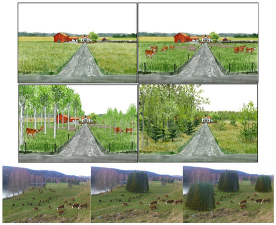 In the first of these preference studies, real estate agents were asked to estimate the likely market value of residential buildings surrounded by various land use alternatives [36]. The latter studies have been web-based surveys with 1000 respondents each from TNS Sifo’s online panel consisting of randomly selected Swedes aged 18–75 [37]. The respondents were shown drawings or photos of different land use options. Through manipulation, the photos depicted the same kind of grazing animals so that the respondents would rank the alternatives entirely based on the landscapes without being influenced by whether the grazing animals were more or less appealing. The respondents were asked the question “Suppose that you live or often travel overlooking these landscapes. Rank the landscapes from the best to the worst based on your preferences”. In one case, the respondents were instead asked to evaluate the options on a five-point scale from low value = 1 to high value = 5 based on their preferences [37,38].