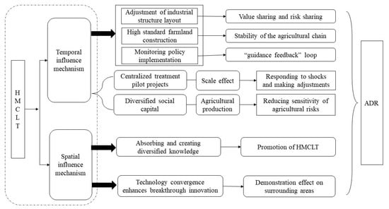 HMCLT is a complex issue that aims to adjust interactions between ecological environment services and human activities to realize sustainable agricultural production. With the dynamics of HMCLT, a series of policy changes, capital support, and technological innovation took place that can impact ADR. Specifically, HMCLT can positively affect ADR from both temporal and spatial perspectives (Figure 1).