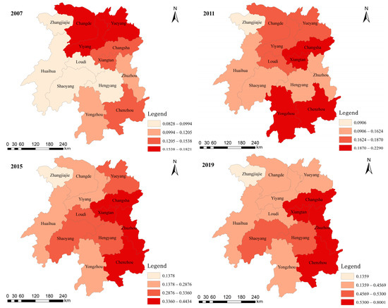 The ADR values of all cities in Hunan province from 2007 to 2019 were calculated based on the entropy weight method. The natural fracture point method was then applied to map the spatial pattern of ADR in Hunan province (Figure 2). From a time dimension, the evolution of ADR in Hunan province is divided into two stages: slow rise (2007–2013) and steady rise (2014–2019), with significant phased characteristics. In 2007, the ADR value in Hunan province was 0.128, and it fluctuated to 0.238 in 2013 before proliferating to 0.520 in 2019. Shaoyang, Yueyang, Yongzhou, and Changde first experienced falling and then rising, the ADR level of Zhangjiajie, Yiyang, Hengyang, and Chenzhou showed a feature of first rising and then fluctuating, while Huaihua demonstrated a downward trend. At the same time, the ADR level of Changsha, Zhuzhou, and Xiangtan fluctuated and rose. From a spatial dimension, the intra-provincial differentiation of ADR in Hunan province exhibited a widening trend, with higher-value cities moving from the initial concentration in Yueyang, Changde, and Yiyang to Changsha-Zhuzhou-Xiangtan, while the range of lower-value cities decreased in circles. The spatial pattern shows “ridge” distribution characteristics along the southwest line, with Changsha-Zhuzhou-Xiangtan urban agglomeration at the core and extending toward the northeast.