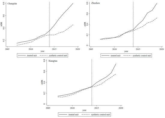 The evolution of the ADR of pilot cities and their synthetic cities for HMCLT can be seen in Figure 3, which shows that prior to HMCLT policy implementation, the ADR levels of Zhuzhou and Xiangtan were closer to their synthetic ADR level, which indicates that the synthetic pilot can fit the real pilot. It is notable that some differences in ADR exist between Changsha and its synthetic pilot area because Changsha is the economic and political center of the Changsha-Zhuzhou-Tanzhou urban agglomeration. Green agricultural technology, modern agricultural development, and agricultural labor input are at leading levels, thus the independent variables of other cities cannot fit the trends of ADR in Changsha.