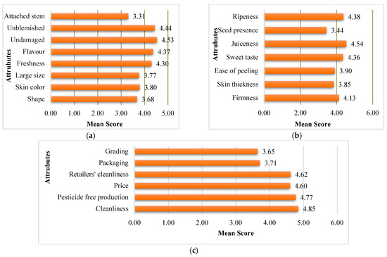 Mean consumer importance rating scores for Kinnow quality attributes. (a) Search attributes, (b) Experience attributes, (c) Safety and marketing attributes (Source: Authors’ calculations).