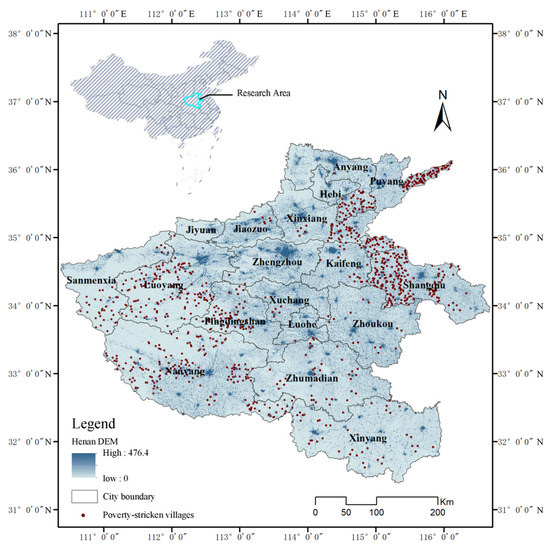 Henan Province is in the central part of China. The land area of Henan Province is between 31°23′–36°22′ north latitude and 110°21′–116°39′ east longitude, with a total area of 167,000 square kilometers (Figure 1). It is an important transportation hub and passenger logistics information flow center in China. The terrain of Henan Province is high in the west and low in the east. The Taihang Mountains, Funiu Mountains, Tongbai Mountains, and Dabie Mountains are distributed in a semicircle along the provincial boundary in the north, west, and south. The central and eastern parts are the Huanghai and Huaihai alluvial plains. Plains, mountains, and hills account for 55.7%, 26.6%, and 17.7% of the total area, respectively. Most of Henan Province is in a warm temperate zone, and the south is within a subtropical zone. It belongs to a continental monsoon climate, with a transition from a north subtropical zone to a warm temperate zone. The annual average temperature from the south to the north of the province is 10.5~16.7 °C, and the average yearly precipitation is 407.7~1295.8 mm. The most rainfall occurs from June to August. By the end of 2021, Henan Province had 17 prefecture-level cities, 21 county-level cities, and 82 counties under its jurisdiction, with a permanent population of 98.83 million, including 55.79 million urban residents and 43.04 million rural residents, and a GDP of CNY 5888.741 billion and an annual per capita GDP of CNY 59,410. Henan Province, China’s largest grain production province, has a cultivated area of 6.871 million hectares, many rural residents, and a high proportion of residents engaged in agricultural labor [31]. Due to a lack of infrastructure, reduced resources, limited access to education, and limited markets, some rural settlements cannot provide a good development foundation for enterprises, resulting in difficulties with employment for residents. Residents rely mainly on farming as their primary source of income, ultimately becoming poverty-stricken. The number of poverty-stricken people and villages in Henan Province is far more than in the southeast coastal areas. Henan Province is in a plain, unlike other regions where poverty-stricken villages are mainly distributed in mountains and hills.