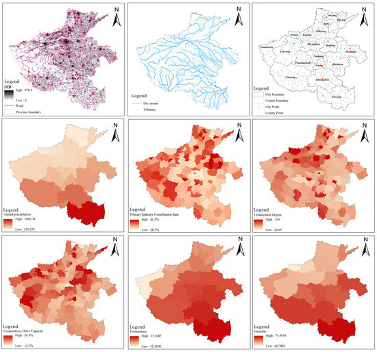 The data selected in the study covered geographical location, socio-economy, basic public services, environmental livability (Figure 2), and specific names and sources (Table 1). These parameters were gathered from various sources and were processed and converted into raster data of 30 × 30 m for convenient handling using ArcMap 10.8 software.