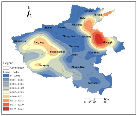 Kernel density analysis is a non-parametric surface density estimation method that estimates the density value of spatial points with the help of dynamic cells, indicating that a geographical event has a high probability of occurrence in an area with a high spatial point density and a low probability of occurrence in an area with a low spatial point density [37]. This paper analyzes the spatial density distribution of poverty-stricken villages in Henan Province with the help of kernel density analysis. The expression of kernel density estimation is: