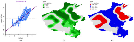 Local autocorrelation of kernel density in the spatial distribution in the poverty-stricken villages: (a) Moran’s I scatterplot; (b) LISA significance map; and (c) LISA cluster map.