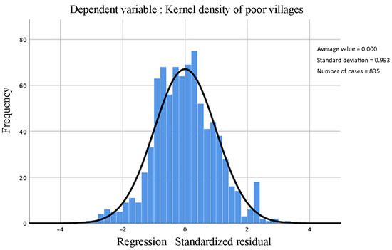 The least squares linear regression model was used to analyze the influencing factors of the spatial distribution of the poverty-stricken villages in Henan Province. First, the statistical data of the influencing factors were processed as dimensionless. The result of the residual histogram showed (Figure 7) that the residual mean was close to zero, the standard deviation was close to one, and the data presented a normal distribution, which means that the linear regression model of the influencing factors and the spatial distribution of the poverty-stricken villages was correct. The beta value was the dimensionless regression coefficient, representing the correlation value of the independent variable and dependent variable. According to the p-value, the impacts of the distance to the County, distance to a city, primary industry contribution rate, urbanization degree, cooperatives drive capacity, road network density, distance to a fast road, distance to a slow road, THI, and days of suitable temperatures on the spatial distribution of the poverty-stricken villages were significant, while the distance to a river was not. The primary industry contribution rate, road network density, distance to a fast road, HI, urbanization degree, and cooperatives drive capacity were negatively correlated with the spatial distribution of the poverty-stricken villages. The distance to the County, distance to a city, distance to a river, distance to a slow road, THI, and days of sustainable temperatures were positive correlated with the spatial distribution of the poverty-stricken villages, and the THI had the closest relationship with the distribution density of the poverty-stricken villages (Table 2).