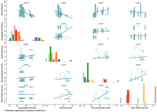 According to the results of the regression analysis, the p-value of the distance to a river was greater than 0.05, which was not significant. Therefore, after removing this factor, the spatial relationship between the distribution density of the poverty-stricken villages in Henan Province was analyzed from four dimensions (geographical position, socio-economy, basic public services, and environmental livability) to find out the factors or potential advantages that affected the development of the poverty-stricken villages (Figure 8). The results showed that environmental livability positively correlated with the distribution density of the poverty-stricken villages. The higher the distribution density of the poverty-stricken villages, the better the livability of the regional environment. Geographical location, socio-economy, basic public services, and the distribution density of the poor villages were negatively correlated, and the number of poor villages in areas with convenient transportation conditions, high public service levels, and fast economic development speed was small. Improving transportation and upgrading basic services would have a good effect on poverty alleviation and development in poor villages, and the development of the County’s economy could also improve the economic levels of the poor villages around the County. The interaction results of the four aspects of the factors showed a dual-factor-enhanced relationship between the factors.