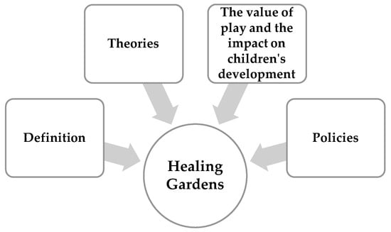 Specifically, a deductive approach was adopted to gather evidence from previous research [] and to categorise the findings from the selected publications based on the following predetermined themes: (1) the definition of a healing garden, (2) theories, (3) the value of play and its impact on children’s development, and (4) policies (Figure 1).