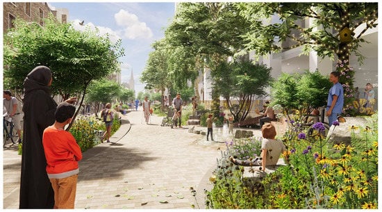We found that healing gardens are being overlooked as a solution to current issues, such as the lack of planning for the location of children’s healthcare facilities regarding levels of air pollution. For example, “2 of the biggest children’s hospitals in the UK, Great Ormond Street Hospital and Birmingham’s Children Hospital, are located in areas with unsafe levels of pollution” []. Additionally, over 2000 health centres are in areas that have some of the most life-threatening air pollutants []. Therefore, adapting the outdoor environment to make it safe for children to play by implementing healing gardens is the most feasible solution, as “Green spaces can improve the quality of air we breathe” [] (p. 14). This is already under way; the redeveloped proposal for Great Ormond Street Hospital is considered industry leading and includes a strategy to reduce the pollution in the area through green infrastructure []. This is also crucial for the reduction of noise pollution as noise can reduce any physiological, restorative benefits of healing gardens [,]. Noise pollution can be reduced through thick vegetation and trees []. Figure 2 shows the proposed green infrastructure outside Great Ormond Street Hospital to reduce pollution.