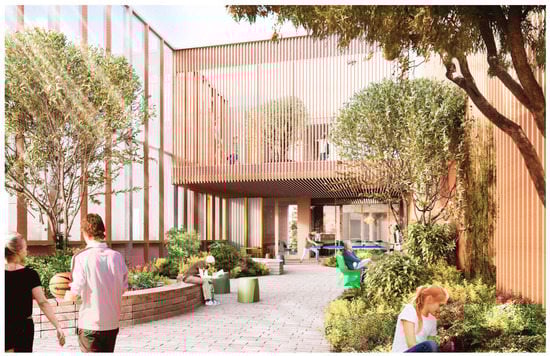 The advantages of healing gardens in children’s hospitals have been examined in several important studies []. In addition, there has been an increase in the use of salutogenic and biophilic design approaches in healthcare environments over the last decade [].