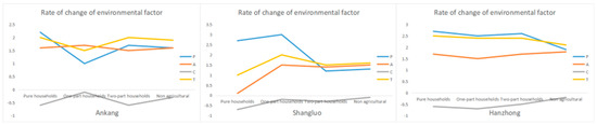 As the main economic activity subject and basic decision-making unit in rural areas, the input of livelihood capital and the choice of livelihood strategies are closely related to the livelihood benefits of rural households. Farmers’ livelihood benefits are closely related to their livelihood activities, and choice of different livelihood strategies (h); for example, there are differences in the methods and intensities of natural resource use among pure households, one-part households, two-part households and non agricultural natural capital. The irrational livelihood strategies adopted by farmers directly lead to the destruction of the natural environment, which reduces the area of forests and grasslands, and affects the species diversity and ecological restoration function of wetlands; in this way, the large-scale consumption of resources and the change of the natural environment change the impact on the environment, and the livelihood benefit is reduced, which leads to the serious threat to the sustainable development of farmers’ livelihood. The difference analysis of the environmental impact of different livelihood strategy groups can be obtained by the change of farmer household type h, i.e.,: