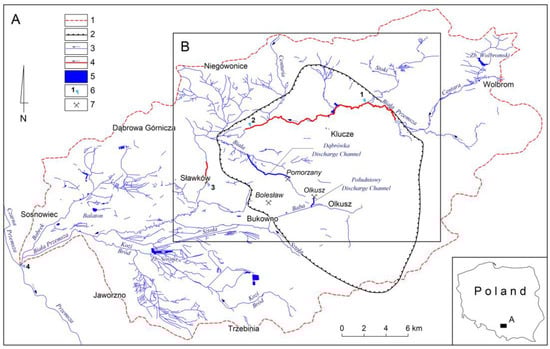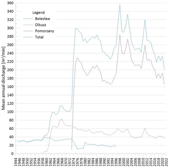 - As a result of mining activities, the Biała Przemsza River changed its character to an infiltrating one, a quantitative depletion of groundwater resources in the range of the depression cone of the mine drainage occurred, and there was a reduction in the flow of the Biała Przemsza River. At the same time, mine water was discharged into the Biała and Sztoła Rivers—tributaries of the Biała Przemsza. Further radical reduction in the flow of the Biała Przemsza and its tributaries occurred after the decommissioning of Zn-Pb ore mines and stopping the mine water discharge.