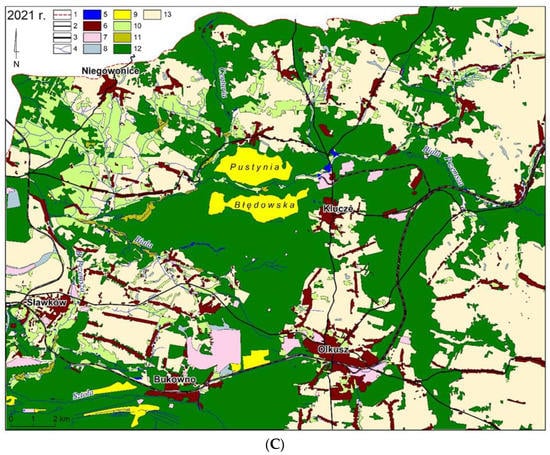 - The following trends in spatial development in the Biała Przemsza valley could be observed: rapid urbanisation and industrialisation in the 21st century, marked reduction in the surface area of arable land and sands, and dynamic growth of the surface area occupied by forests. The hydrographic network evolved.
