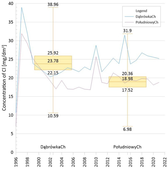 | Cl (mg/L) | 4.3–189.0 (22.5) | 5.3–41.5 (11.1) | 1.8–344.4 (14.1) | 3.3–36.2 (11.0) | No data | (10.59–38.96)/(6.98–31.90) * | (22.15–23.51)/(16.81–18.43) * |
