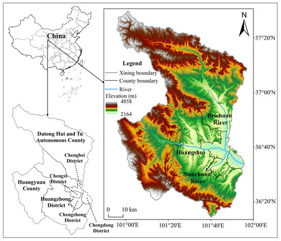 Xining City is located in the northeastern Qinghai-Tibet Plateau, between 36°13′–37°28′ N and 100°52′–101°54′ E (Figure 1). The terrain is high in the southwest and low in the northeast, with alluvial plains, hills, and mountains as the main landform types. The Huangshui River and its tributaries, such as the Beichuan River and the Nanchuan River, run through Xining from the west, north, and east, respectively, which forms a valley zone of a “cross” in which the central urban area is distributed along the river, and agriculture and industry gather. Xining has a semiarid climate, with an average annual temperature of ~5.5 °C and an annual precipitation of ~500 mm. As the capital city of Qinghai Province, Xining borders Haidong City, Haibei Tibetan Autonomous Prefecture, and Hainan Tibetan Autonomous Prefecture, which govern five districts and two counties, including the Xining (National) Economic and Technological Development Zone, with a total of 2.468 million permanent residents and an urbanization rate of 78.63% in 2020. As the core city of Lanzhou-Xining, urban agglomerations and the pivotal logistic routes bear the growing burdens of trade and service, which has caused Xining to accelerate its urban expansion and construction. Human activities have caused significant pressure on the ecological environment, such that the structure of the land use has changed significantly.