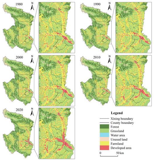 The main types of land use in Xining are grasslands, forests, and farmlands, with the three types of land use accounting for more than 90% of the total area of Xining year-round. Grassland, as the main land use type in Xining, occupies more than 50% of the total area each year, followed by forest, whereas water area is the land use type with the smallest area and the lowest proportion of the total area among all types of land use in Xining. The interannual variation in different land types varied significantly over time, with forests, water areas, and unused land being the land use types with relatively stable annual variation over the past 40 years, with an increase or decrease in area of less than 2 km2 (Table 2). The annual variation in grassland, farmland, and developed area took the year 2000 as the nodal point. During the period from 1980–2000, the area of farmland and grassland decreased by 4.24 km2 and 11.89 km2, respectively, and the area of developed area increased by 17.27 km2. Between 2000 and 2020, the area of farmland further decreased by 93.17 km2, and the area of grassland changed from a decrease to an increase of 5.07 km2, with a significant increase in developed area of 86.61 km2.