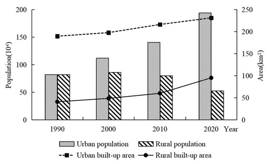 The fluctuating land area of urban developed areas and rural developed areas was influenced by the interannual increase and decrease in urban and rural populations, and the urban and rural developed areas in Xining increased each year during 1990–2020. The urban population continued to increase during the same period, whereas the rural population decreased each year after reaching an extreme value in 2000 (Figure 3). The change in the urban and rural populations mainly occurred from 2010 to 2020, with the increase in urban developed area exceeding the other years during this period, whereas the increase in rural developed area decreased for the first time. A total of 0.1102 million urban civilians and 0.46 million rural civilians were added per 1 km2 of new urban and rural developed area, respectively, between 1900 and 2000, whereas during the period from 2010–2020, the urban population increased by 15,200, and the rural population decreased by 18,300 for each additional 1 km2 of urban and rural developed area. The density of the urban population distribution (10,000 people/km2) and rural population distribution (10,000 people/km2) in the developed area increased from 4.64 times in 1980 to 8.95 times in 2020, and the discrepancy between the urban and rural developed area distribution and urban and rural population distribution in Xining was very distinct.